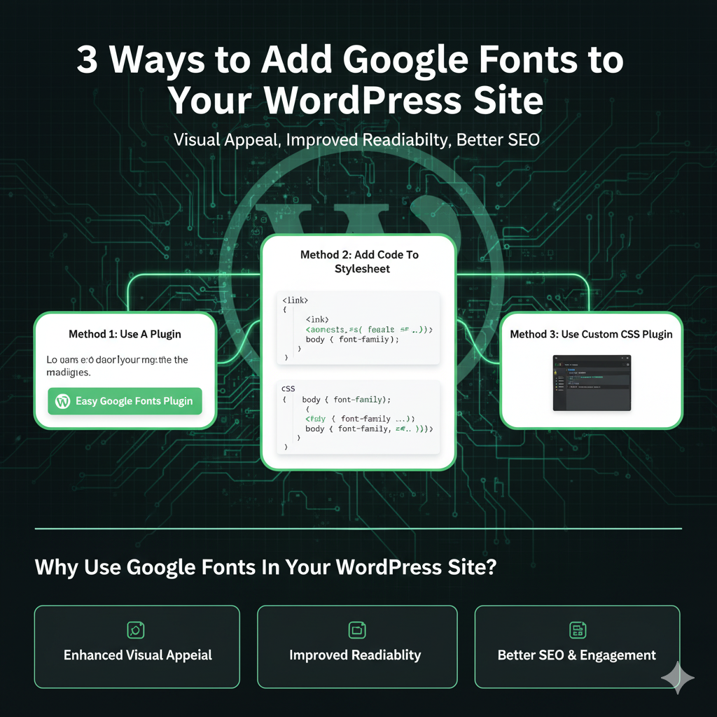 Adding Google Fonts to your WordPress site is easy, with several methods to choose from, including plugins, manual code addition, custom CSS plugins, etc. No matter what your technical skill level is, you can easily use Google Fonts to create a better appearance for your WordPress site.